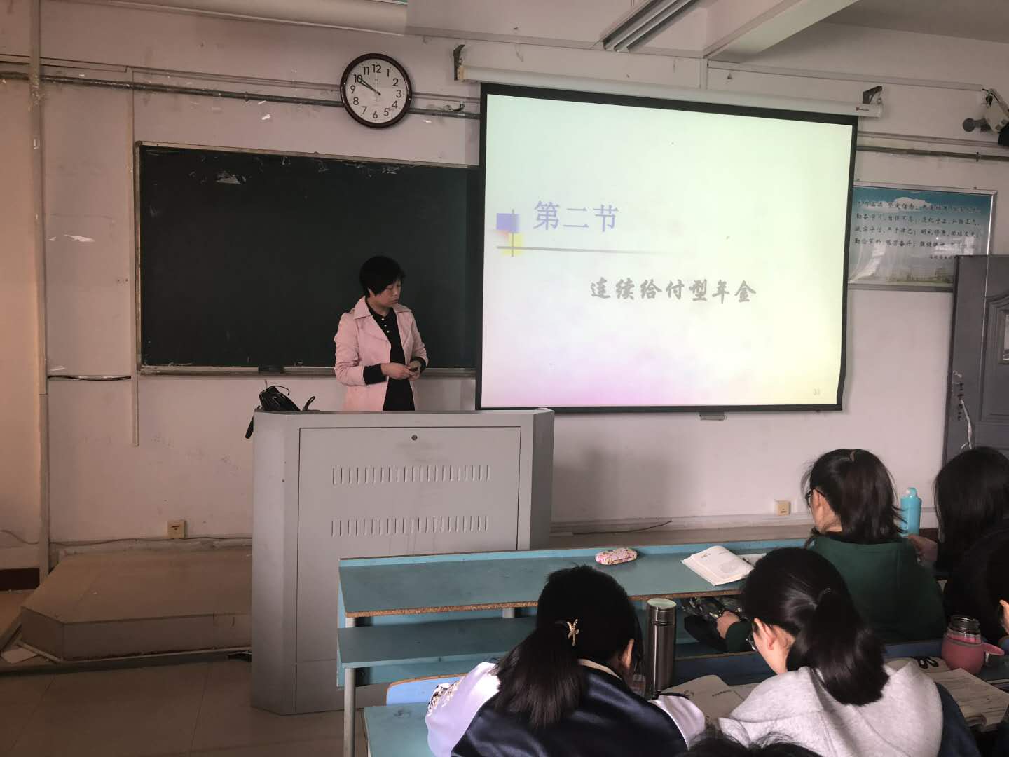 此次公开课由王晶老师讲授,内容是《保险精算》课程中的"连续给付型年金"。王晶老师结合首先回顾了生存年金的精算现值的求法,进而介绍了生存年金的定义,推导出计算公式,并结合实例进行了讲解。听课教师一致认为,王晶老师教学基本功扎实,教学内容组织严谨,课堂气氛热烈。