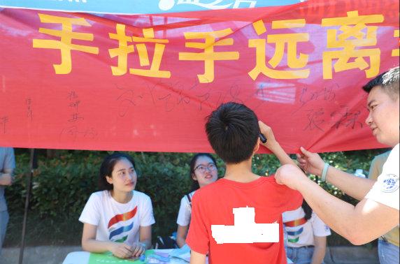 7月13日上午7时许,我院大学生志愿者齐聚绿地国际花都社区开展禁毒防艾宣传活动,他们身着禁毒防艾文化衫的志愿者在人流集中场所激情地演唱着《飘动的红丝带》,同时通过有奖问答,发放各类宣传材料和调查问卷、面对面讲解、联合社区街道推送宣传文章等方式,向居民宣传艾滋病防范、毒品与疾病健康相关知识,引导居民们重视毒品和艾滋病的危害性,提高了群众的健康安全意识和防范能力。活动中,我院大学生们志愿者细致地讲解着宣传页的主要内容,教会群众关注禁毒微信公众号,并耐心解答群众对什么是毒品、毒品有哪些危害、如何抵制毒品等多方面的疑问,引导广大群众树立“珍爱生命、远离毒品”的意识。此次活动的受众人群十分广泛:有城市街区来往的居民、道路两旁的商户、流动人员、中小学生,也有城乡结合部的新型农民,他们不仅耐心地听取大学生们的禁毒宣传,而且都主动地拿起签字笔庄重地在禁毒防艾宣传横幅上签下了自己的姓名。“今天我知道了什么是毒品,更重要的是宣传员阿姨告诉了我毒品的巨大危害。”小学三年级学生张子墨告诉现场宣传员,回到学校以后,将把毒品的危害告诉班里的同学,让大家一起宣传禁毒知识。