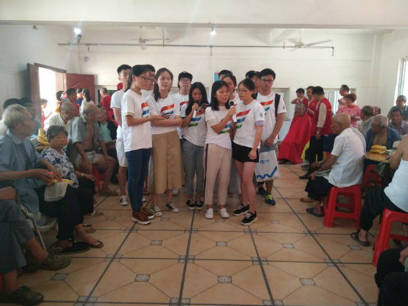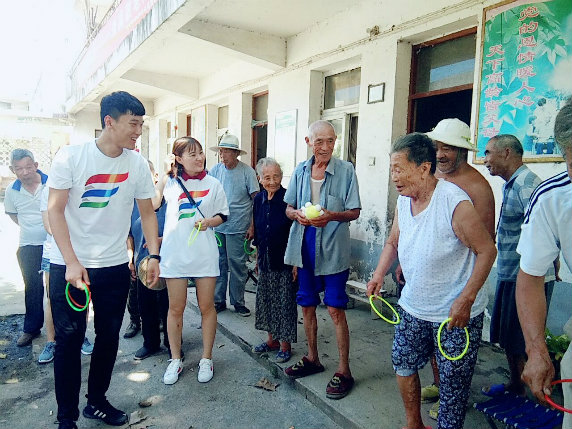 为给老人们带来欢乐,志愿者们精心准备了一些有趣的小游戏和才艺表演。老人们手持玩具圈,站立在分界线,小心翼翼地将手中的圆圈抛出,神色紧张地盯着圆圈飞跃的弧线和掉落的位置。套中获得自己心仪布偶玩具的老人们,开心地手舞足蹈。一位收到礼物的奶奶说到“这是我生命中的第一个布偶娃娃。今天我玩得开心,也很高兴能收到这样一份可爱的礼物。谢谢孩子们。”团队中能歌善舞的志愿者们为老人们演唱了经典老歌、红歌,部分老人也跟随歌声轻轻吟唱,苍老的脸上荡漾着开心的笑容。