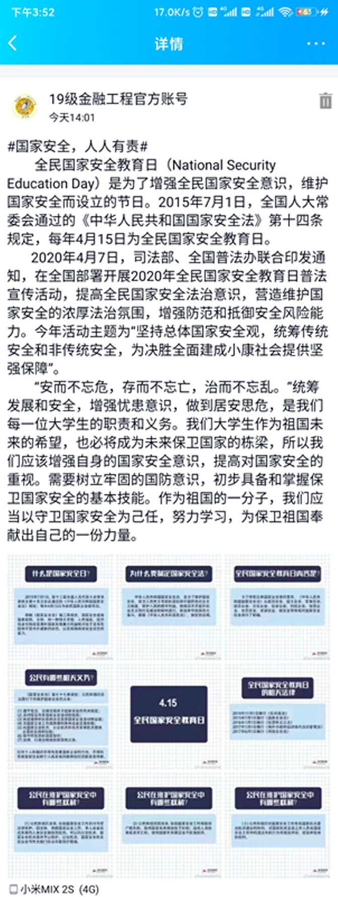 为响应学校与政府的号召,提高同学的国家安全的重视,并提升有关方面的知识。19金融工程班级在4月14日下午举办了“国家安全教育日知识宣传”的活动。活动由徐澜主持进行,共有56人参加。