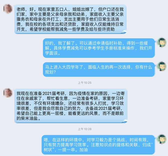 为积极应对因疫情对建档立卡困难家庭带来的影响,及时掌握困难家庭现状,确保脱贫攻坚等各项学生资助政策全面准确落实。7月17日至7月25日,理学院辅导员通过在线视频聊天等方式对建档立卡学生和其他困难学生进行了在线走访活动。