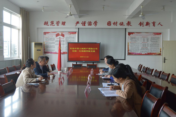 为了提高人才培养质量和深化校企合作,理学院邀请中国大地财产保险蚌埠中心支公司吴刚总经理一行3人于2020年11月16日下午到理学院交流。理学院院长程荣龙、党总支书记梅红、副院长孙西超及毕业班辅导员参加座谈会。