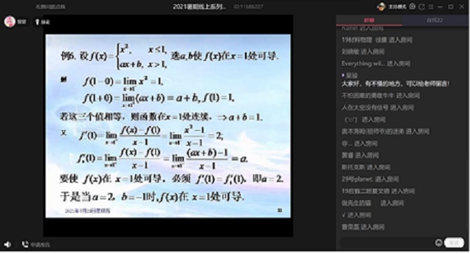 数学线上系列讲座是数理学院教工一支部党员为群众办实事的一部分,观看讲座的学生主要是有意进一步深造的学生,讲座主要针对学生在学习过程中遇到的重点和难点,采取系列专题讲座的形式,对这些知识点进行梳理,解决学生学习过程中遇到的实际问题。讲座一共有12讲,每周二和周五各有一次,从7月20日开始,持续到8月27日,其中高等数学有5讲,概率统计有3讲,线性代数有4讲。讲座采取直播形式,直播结束以后还有回放,方便学生学习。