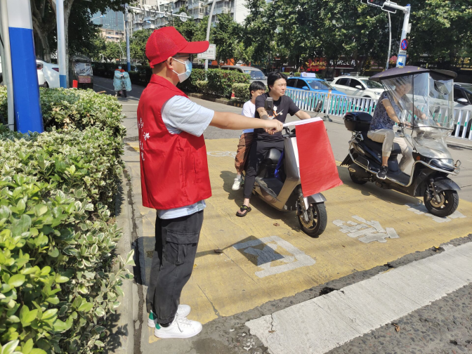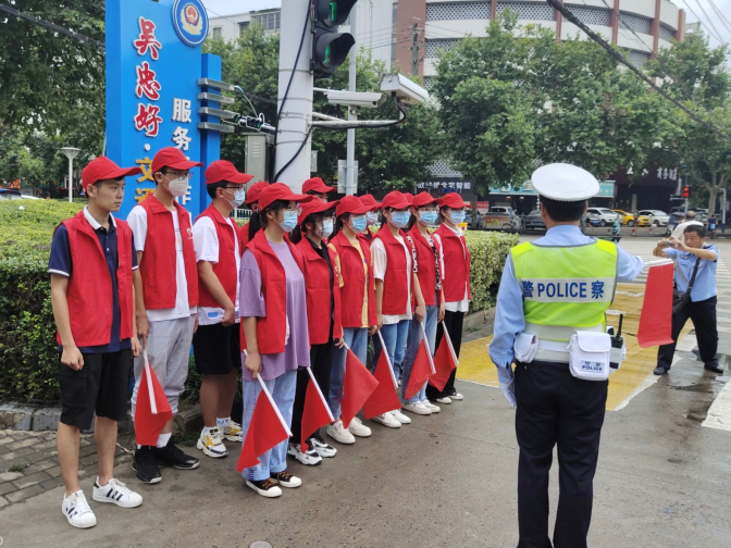 【乡村振兴 建设家园】“乡村振兴,建设家园”小分队积极响应号召,7月9号-11号在蚌埠市涂山路和工农路的交叉路口开展志愿服务活动。每天上午八点,队员按时到达目的地。交警大队负责人向队员们示范如何规范挥动红旗以及讲解每个动作的意思,反复提醒队员在保护自身安全的前提下维持交通秩序。由于该地邻近市中心,人流车流量巨大,队员三人一组有针对性的在人流量比较大的四个路口,进行站岗执勤。各队工作人员统一-着装,身穿红马甲,右手持小红旗,在自己的岗位上挺直身板,克服天气炎热的困难,认真指挥交通,提醒行人注意交通安全,按照交通信号依次有序通过路口。活动过程中,有群众询问路况地址和车站,队员通过手机查询或询问本地人帮助群众解决问题。队员还积极搀扶杵着拐杖,腿脚不便的老人过马路,引导车流避让,并且及时规劝个别前轮超过停止线的非机动车主退回线里。本次实践活动在志愿者们的辛勤劳动下完美落下帷幕。