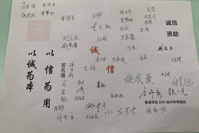 感恩在心、诚信在行、责任在肩。20材料物理班全体同学在签名墙上郑重签下了自己的名字,对诚实守信言行做出承诺。