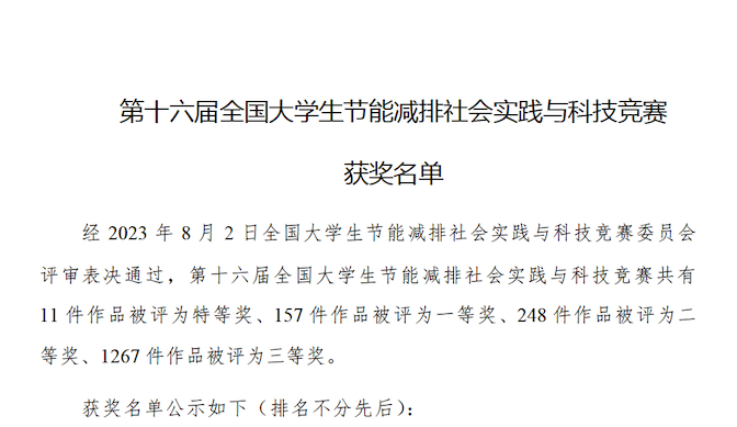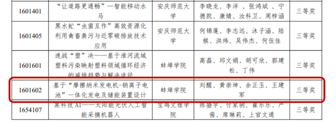 近日,建行杯”第十六届全国大学生节能减排社会实践与科技竞赛决赛落下帷幕。本次竞赛由东南大学承办,大赛贯彻“节能减排,绿色能源”的主题,共吸引国内600余所高校的6852件作品参赛。经过选拔,由数理学院周家峰和孟维利老师指导,2021级材料物理专业刘醒,黄崇坤,余正玉,王建军等四位同学的作品《基于“摩擦纳米发电机-钠离子电池”一体化发电及储能装置设计》,获得全国三等奖。