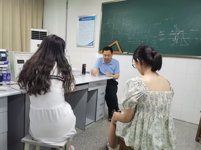 告别了方主任,实践团来到了蚌埠学院数理学院物理实验室,在这里,我们采访了原数理学院院长程荣龙。程院长从1988年开始教学至今,见证了数理学院的设立与发展。程院长向实践团说明了数理学院名字的由来,从最开始的理学系到将化学分出去后改名数理系,到2017年改名为理学院,在2021年改名数理学院延用至今。